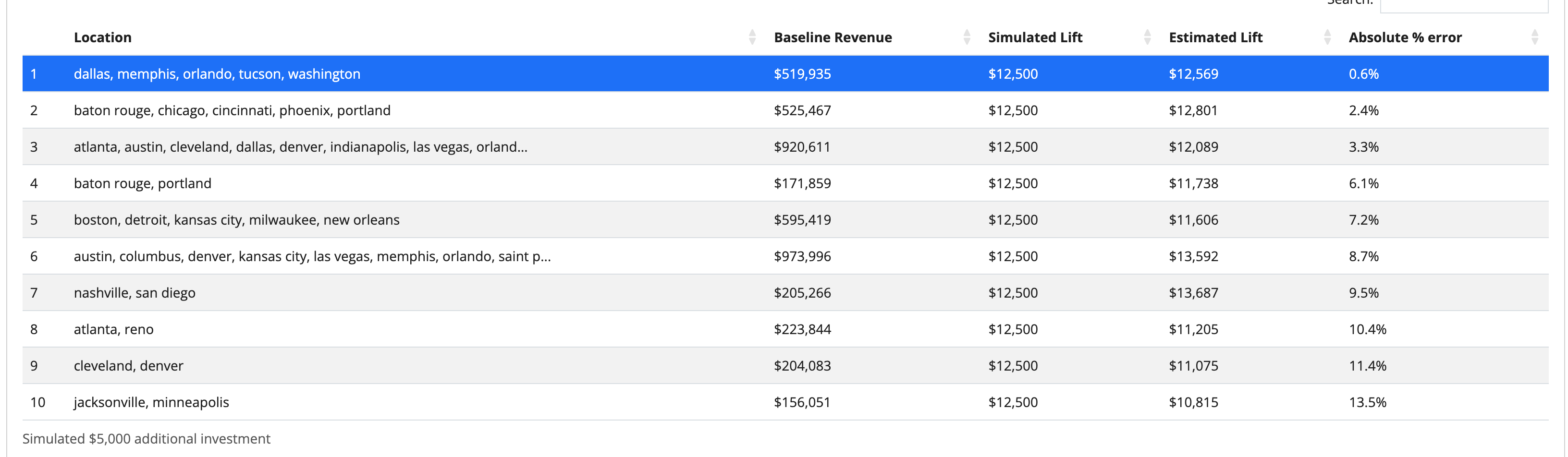Click âDetermine test marketsâ when you are ready. Recast will analyze your data and provide options for various experiment configurations which you will be able to select from. GeoLift ranks the experiment options in terms of the difference between the simulated lift and the lift estimated. If Recast is unable to find test groups that result in low error and statistical significance, it will fail to generate the candidate test markets and instead recommend tweaking your settings. Increasing the spend amount, lengthening the number of days, and increasing the number of test markets are all ways to increase the statistical power.