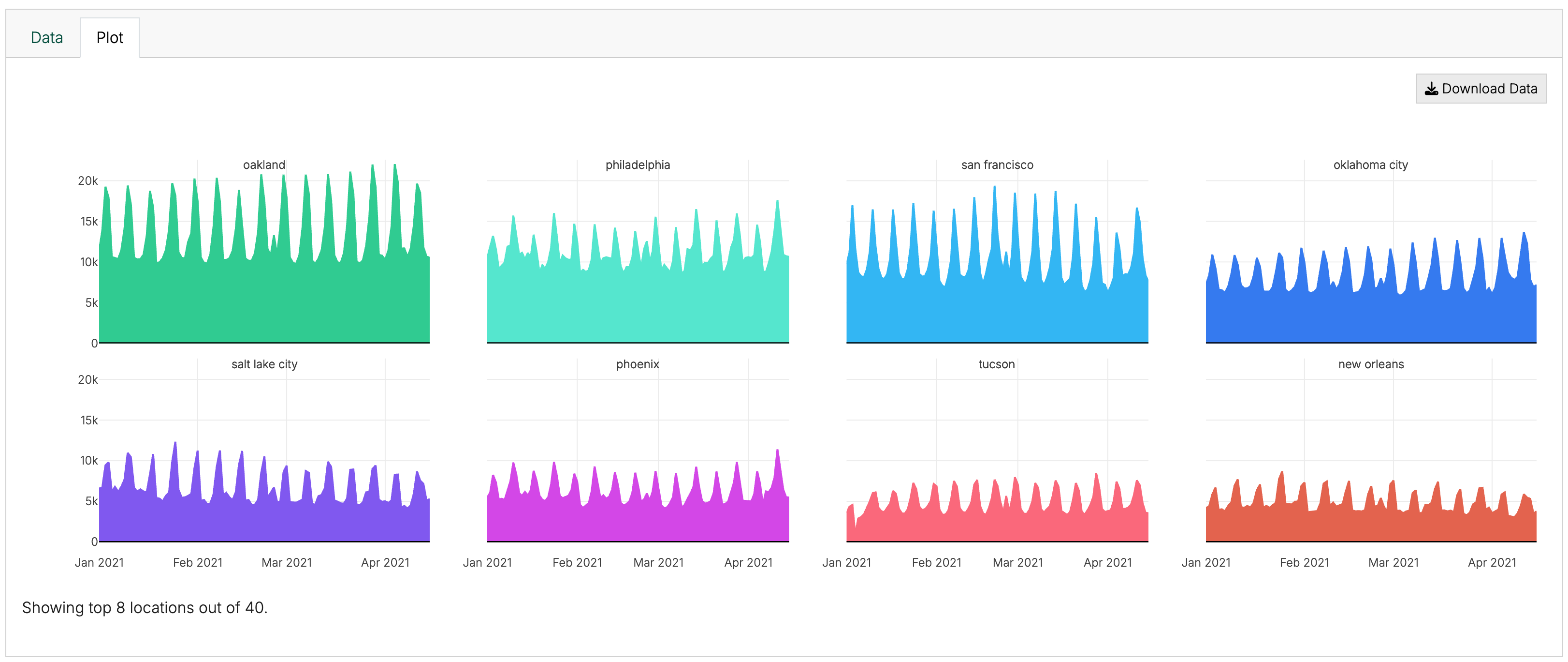Once you have mapped your columns, you can ingest your dataset. You can see your KPI over the time period for your top 8 geographies by volume as well as click through your dataset. Use these visualizations to check for any data problems.