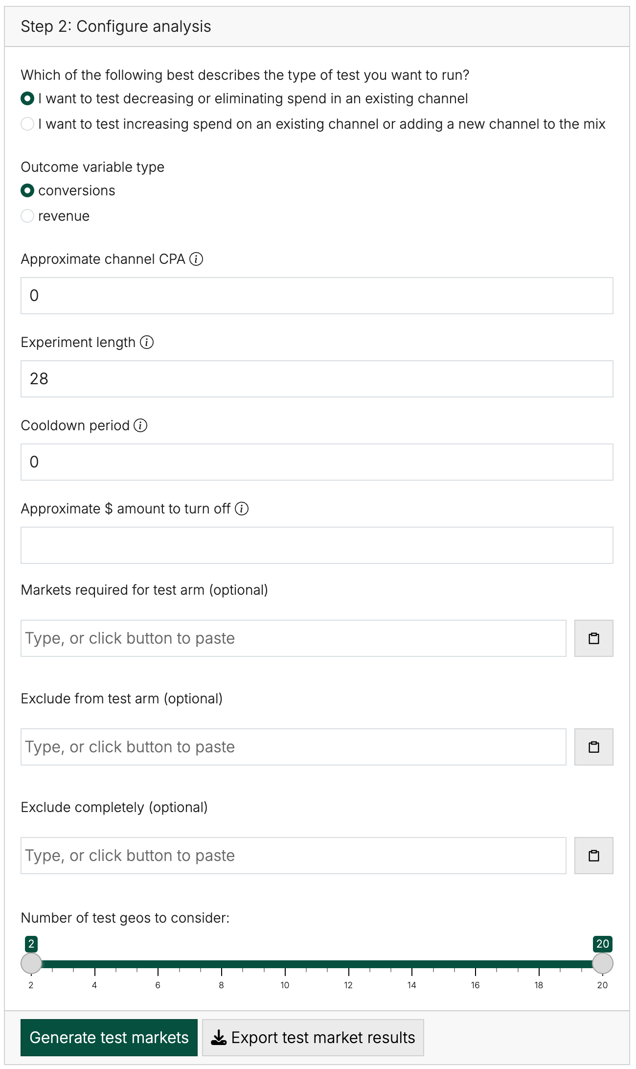 While we donât support that directly, you can design your test as a spend decrease test and as long as the amount of spend you turn off in the test geos is greater than the recommended spend to turn down, the results you get will be at least as statistically powerful as the recommended âspend decreaseâ test. If the recommended amount of spend to turn off is greater than the total spend in that set of geos, you will want to explore other geographies as turning off spend completely wonât provide an adequately powered test.