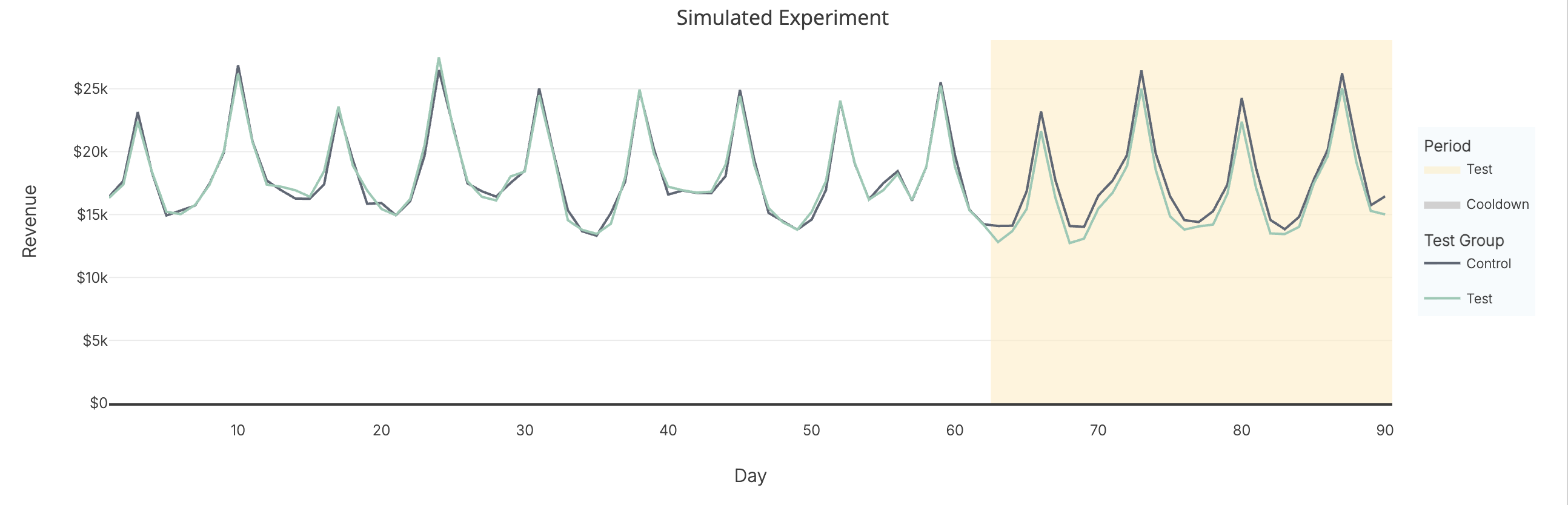 The historical dataset helps the experimentation tool analyze similarities and differences in geographical performance to select the best geographies to include in your test group. Comparison between geographies with similar historical performance results in more powerful statistical analysis as we can more accurately identify the differences as a result of the spend change.