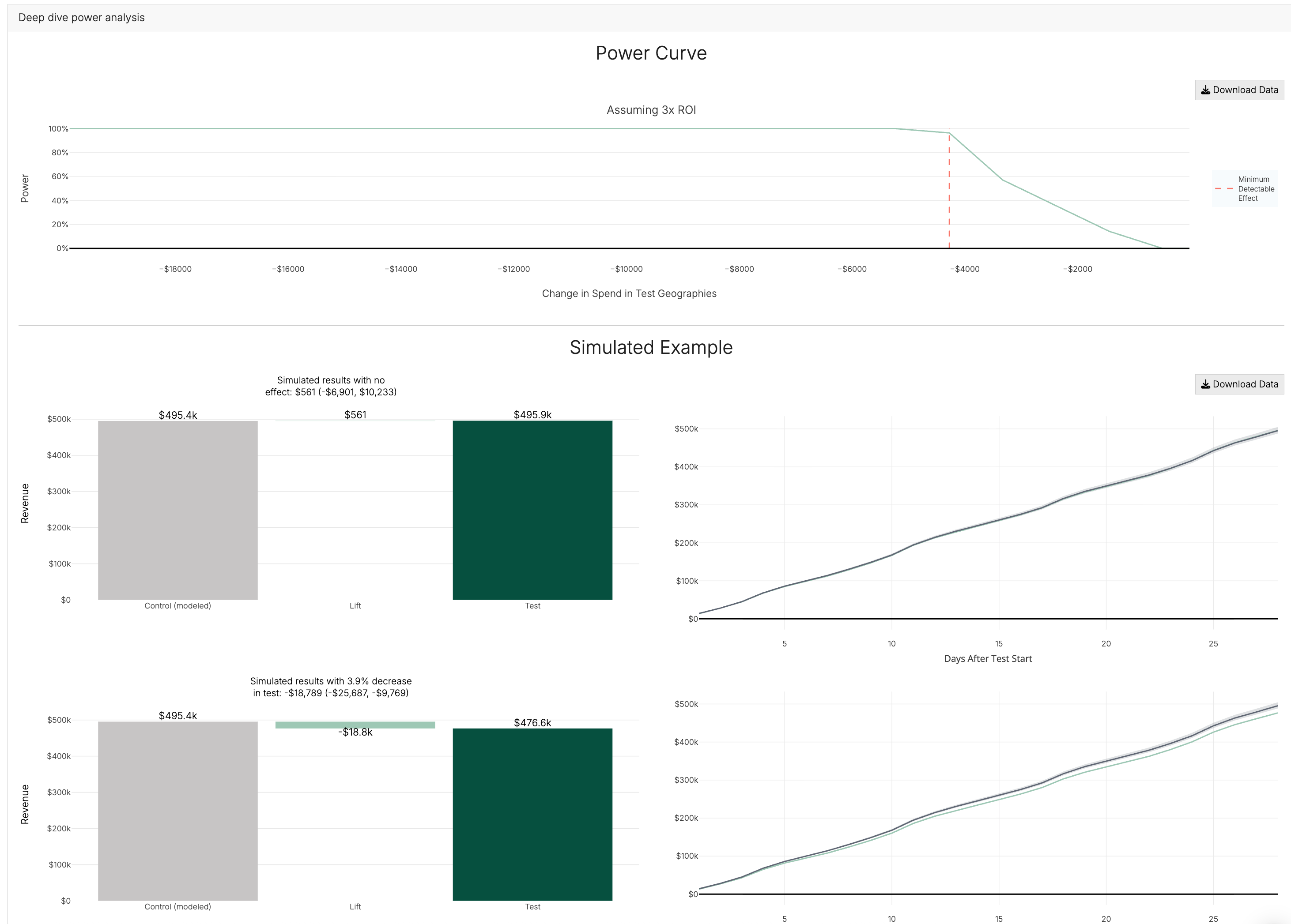 The power analysis graphs below will help you assess the recommended plans. The power analysis runs many simulations for your selected geos in order to help determine how statistically useful the results will be.